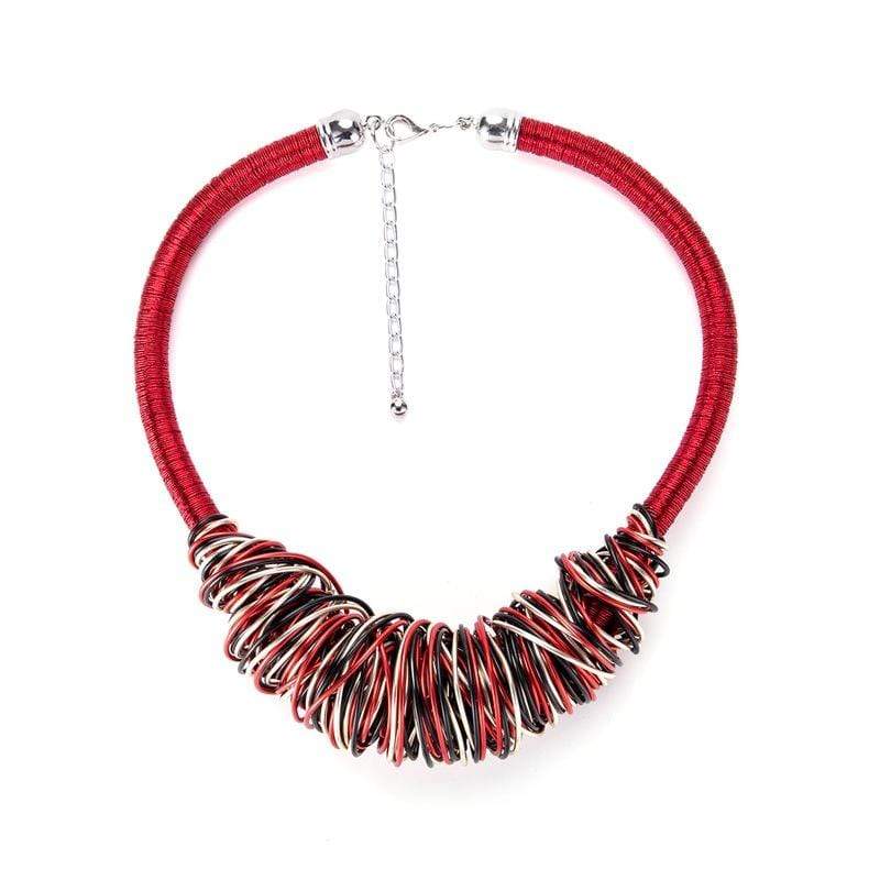 Introducing the perfect accessory for your fashion-forward wardrobe: the Womens Red Wire Wrapped Statement Necklace. Stand out in any crowd with this elegant and eye-catching necklace, designed to elevate any outfit with its unique wire wrapped design and bold red color. A must-have for any stylish woman.